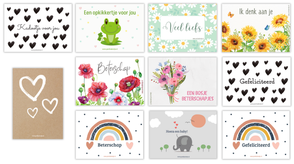 Kies hieronder een kaartje naar wens. Op het kaartje wordt jouw persoonlijke bericht voor de ontvanger(s) met de hand geschreven. Vergeet niet de afzender te vermelden.