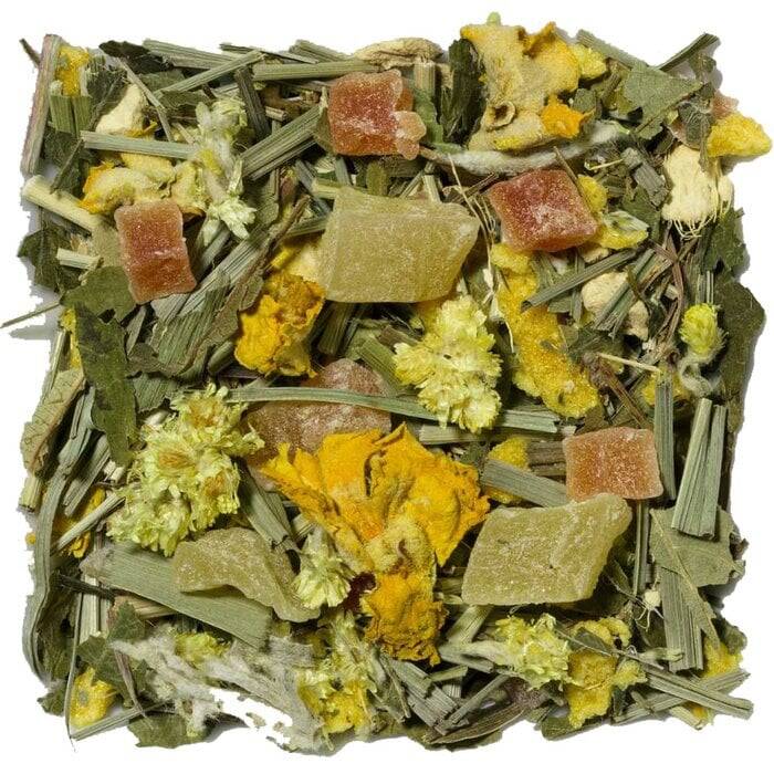 Een mix van citroengras, gember en fruitstukjes die bijdraagt om snel weer op krachten te komen. Verpakt in 25 grams verpakking.