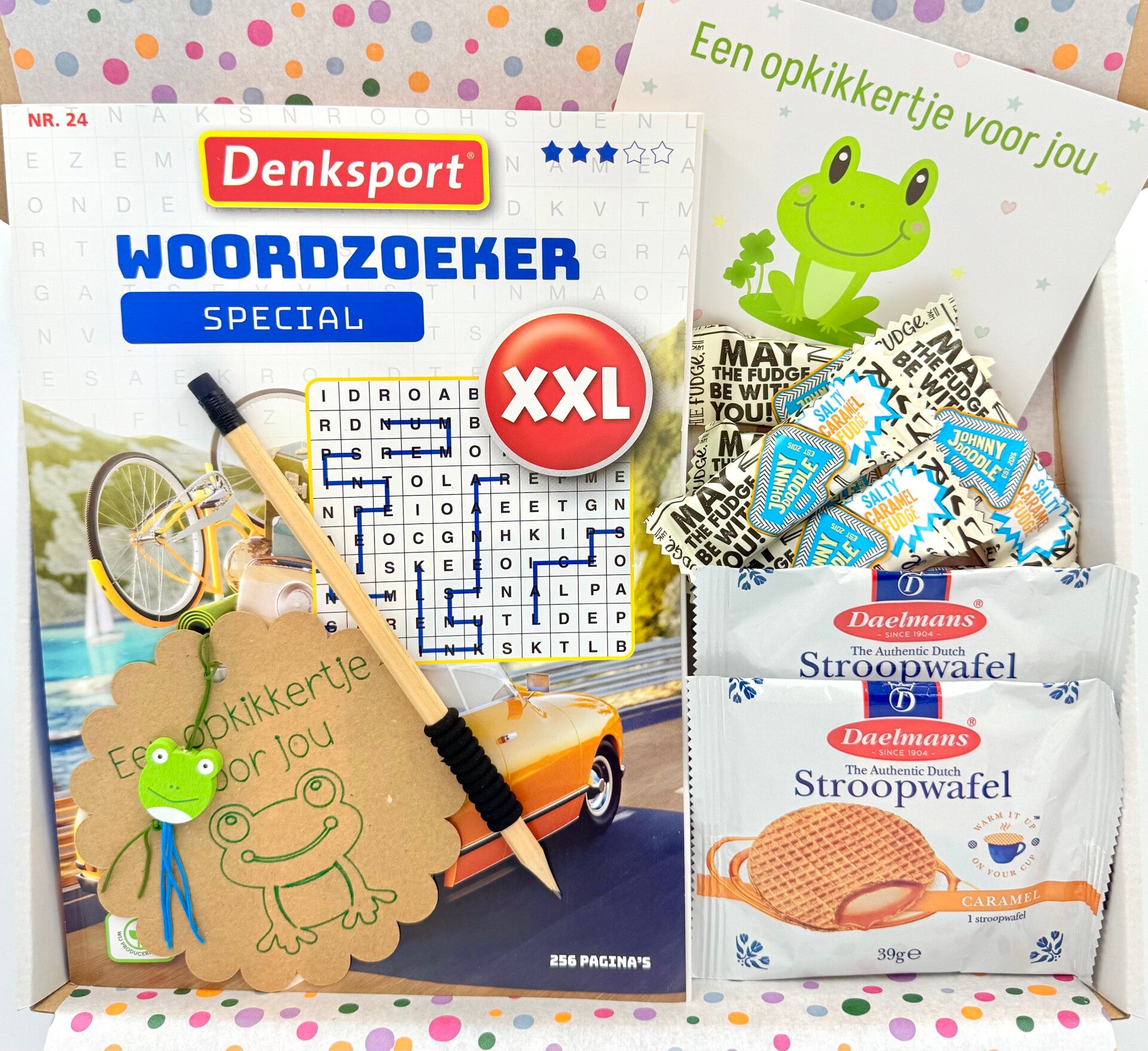 Postkadootje Puzzel | Woordzoeker puzzelboek xxl met potlood | Johnny Doodle fudgeblokjes | Stroopwafels | Gelukje opkikkertje voor jou | Kaartje naar keuze