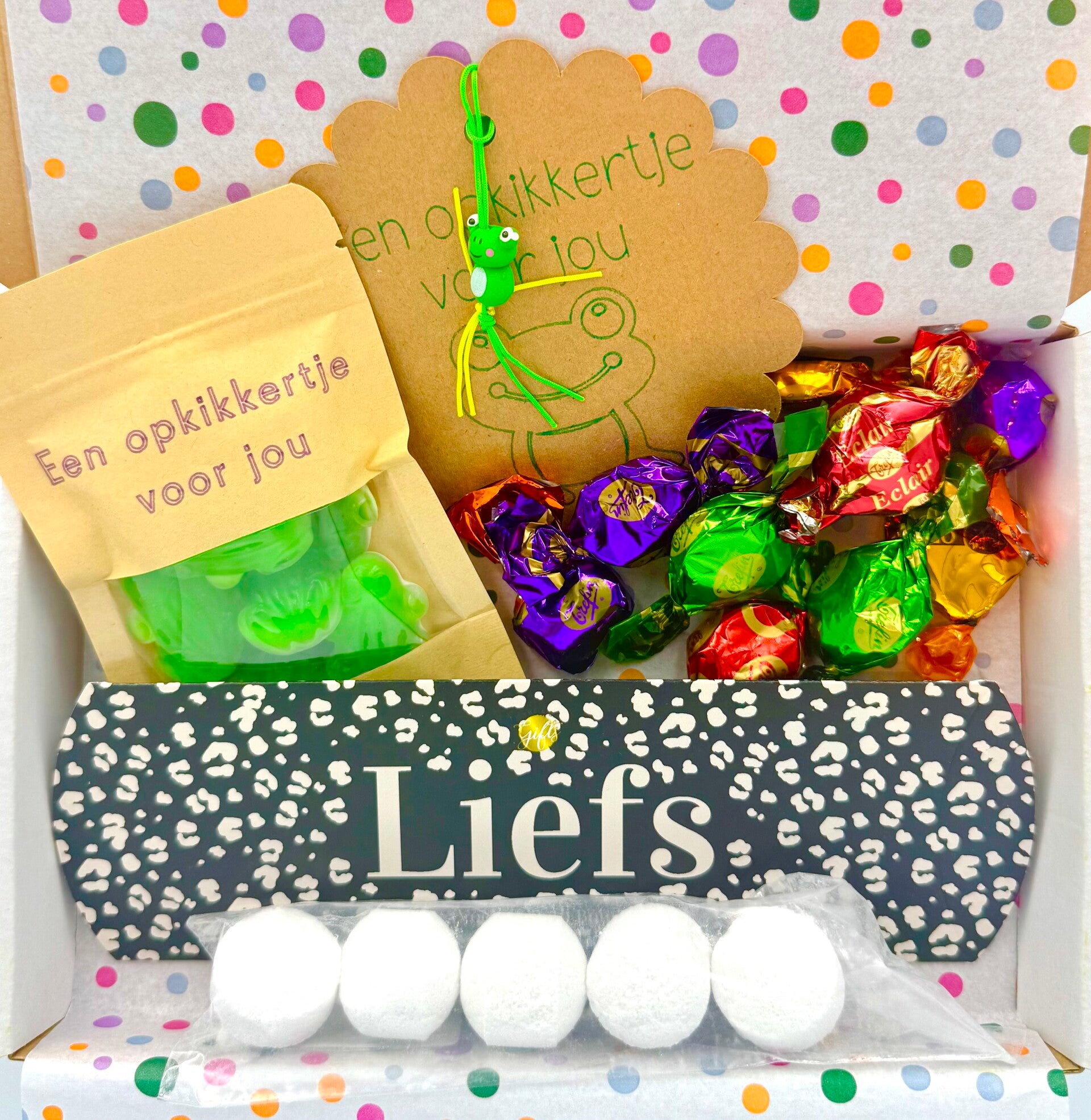 Postkadootje Liefs | Bath bombs in gondeldoosje Liefs | Toffees | Kikkersnoepjes opkikkertje voor jou | Opkikkergelukje voor jou | Kaartje naar keuze