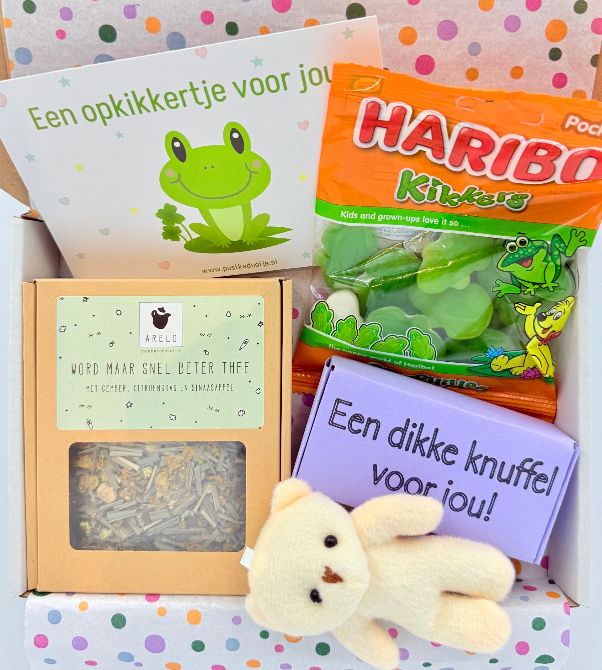 Postkadootje Knuffel | Word maar snel beter thee | Haribo snoepkikkers pocket size | Doosje met knuffelbeertje dikke knuffel voor jou | Kaartje naar keuze