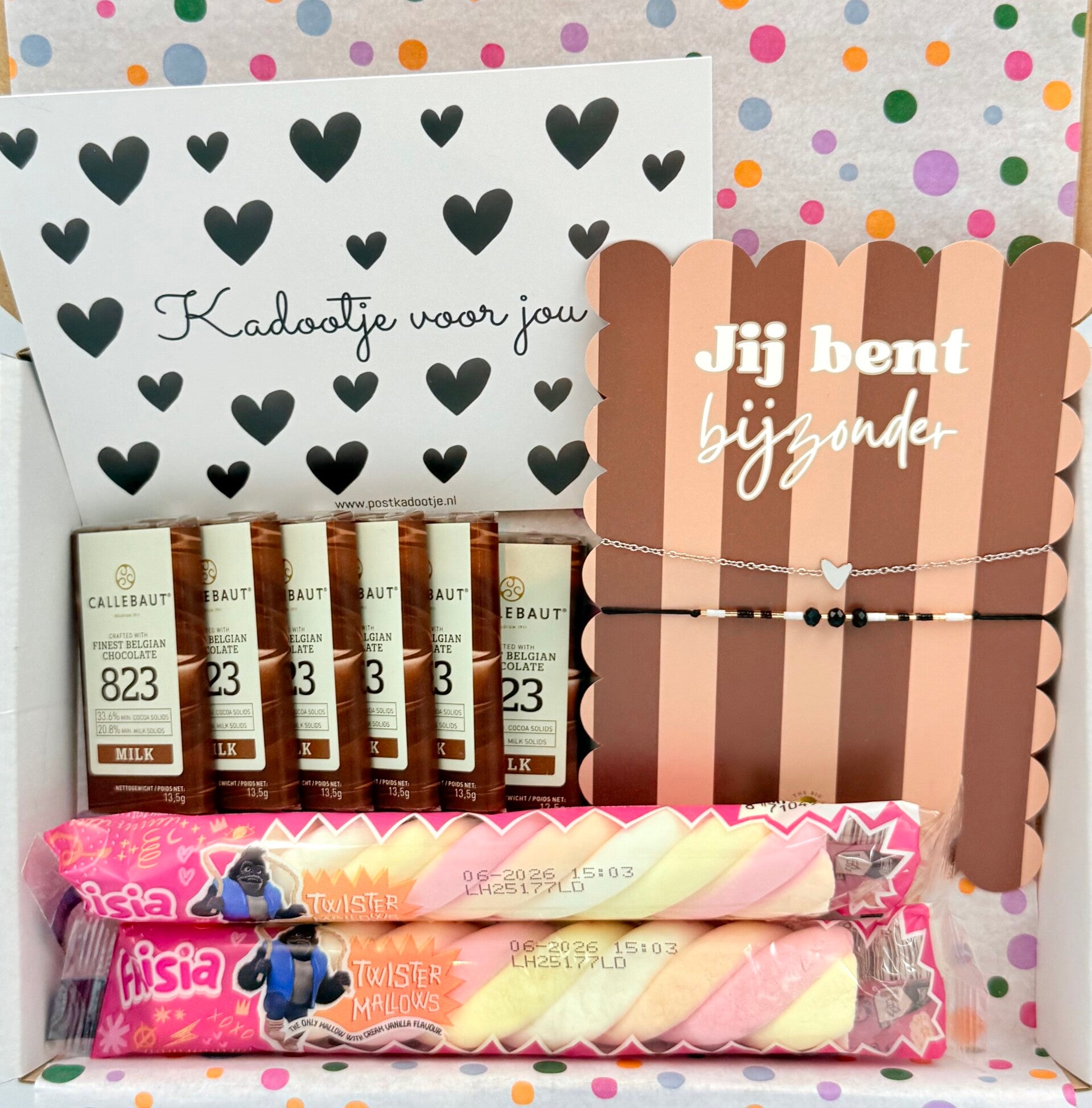 Postkadootje Jij bent bijzonder | Armbandjes met de tekst jij bent bijzonder | Twee spekkies | Mini Callebaut chocoladereepjes | Kaartje naar keuze