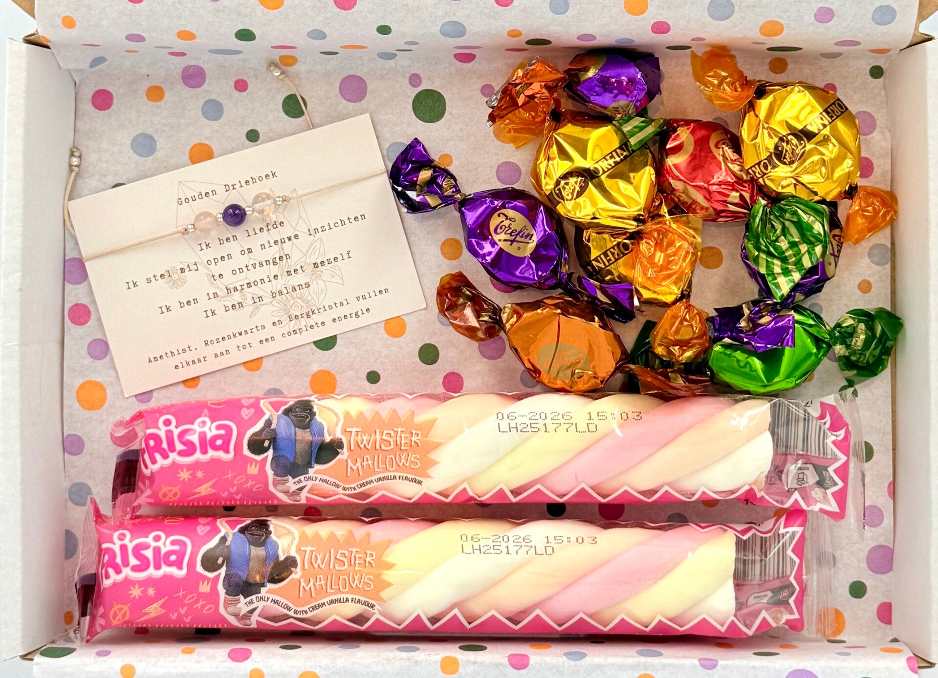 Postkadootje Gouden driehoek | Armbandje verstelbaar de gouden driehoek | Twee spekkies | Verschillende smaken toffees | Kaartje naar keuze