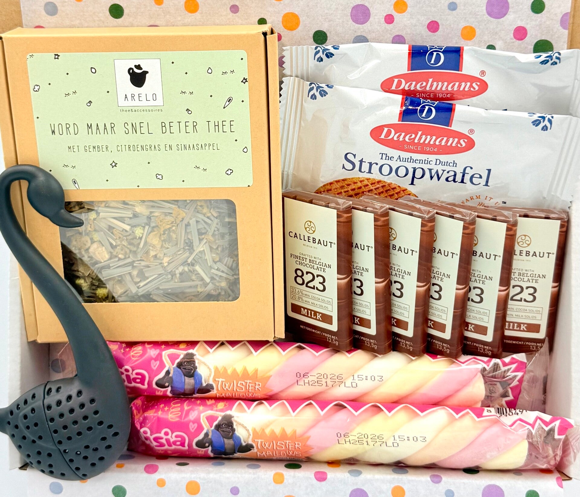 Postkadootje Zwaantje | Word maar snel beter thee | Theefilter zwaan | Stroopwafels per stuk verpakt | Callebaut mini chocolade | Spekkies | Kaartje naar keuze