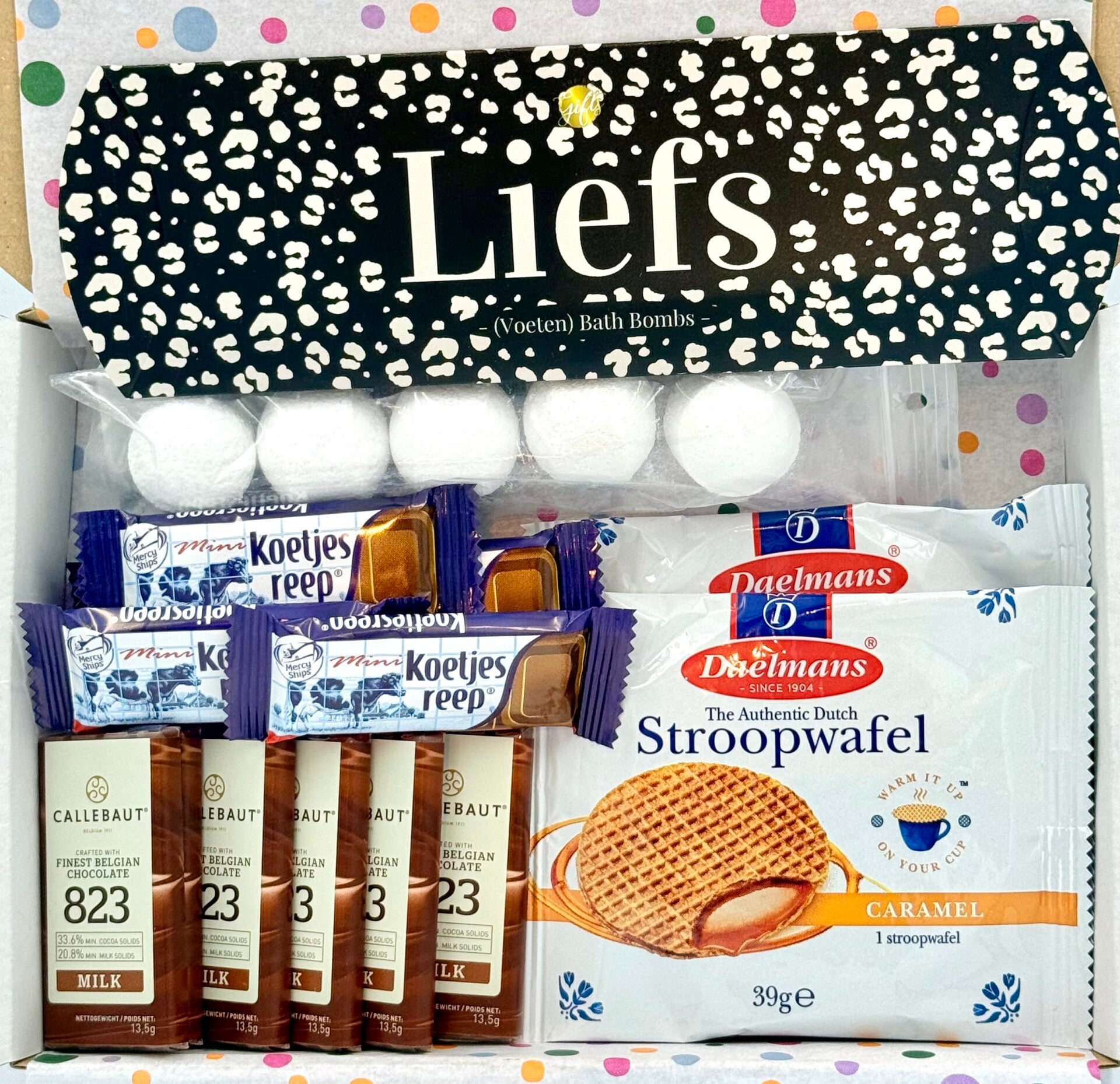 Postkadootje Liefs | Bath bombs in gondeldoosje met de tekst liefs | Koetjes reepjes mini | Stroopwafels per stuk verpakt | Callebaut mini chocolade | Kaartje naar keuze