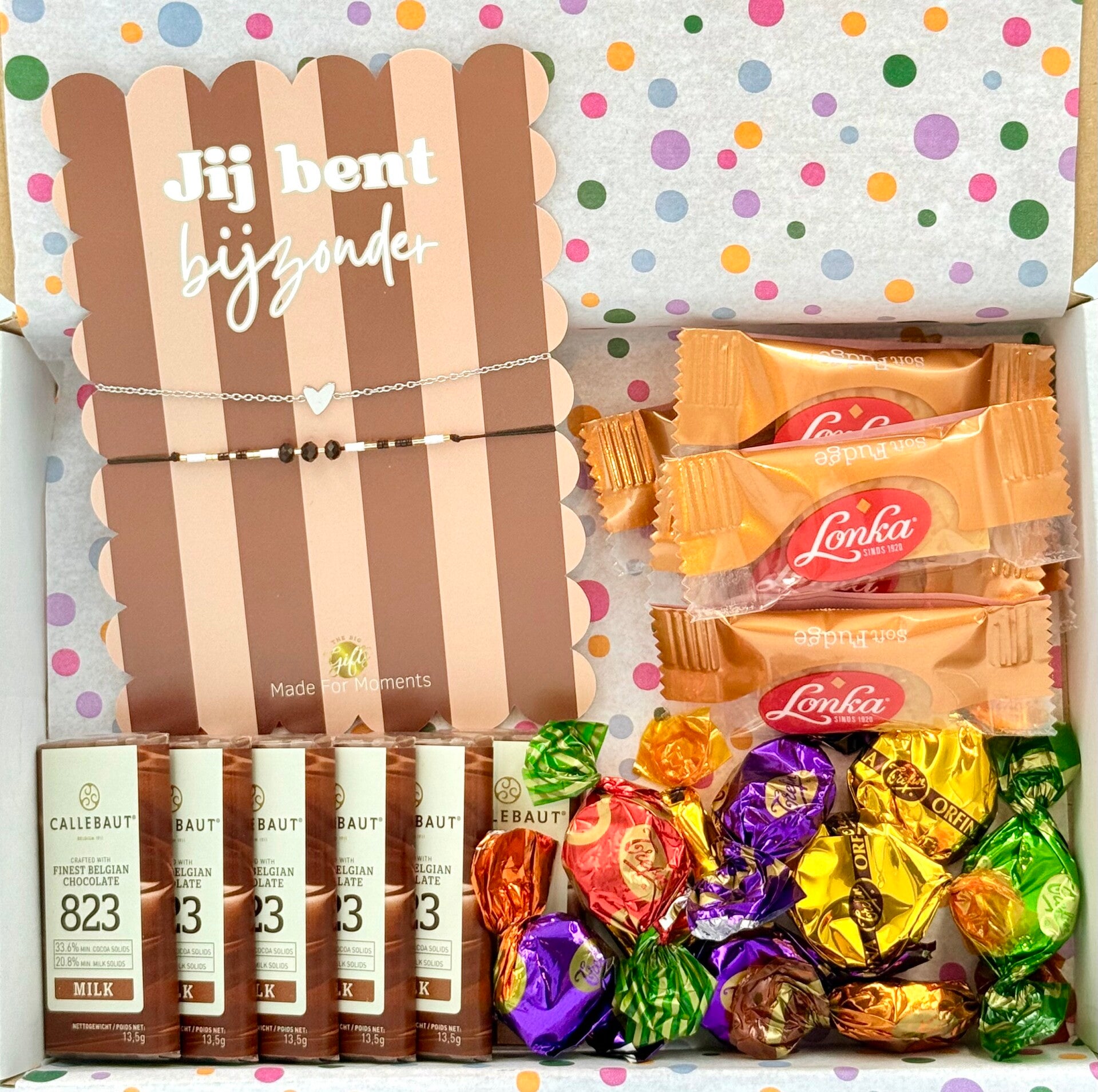 Postkadootje Bijzonderl | Twee armbandjes jij bent bijzonder | Lonka mini fudge | Callebaut mini chocolade | Verschillende smaken toffees | Kaartje naar keuze