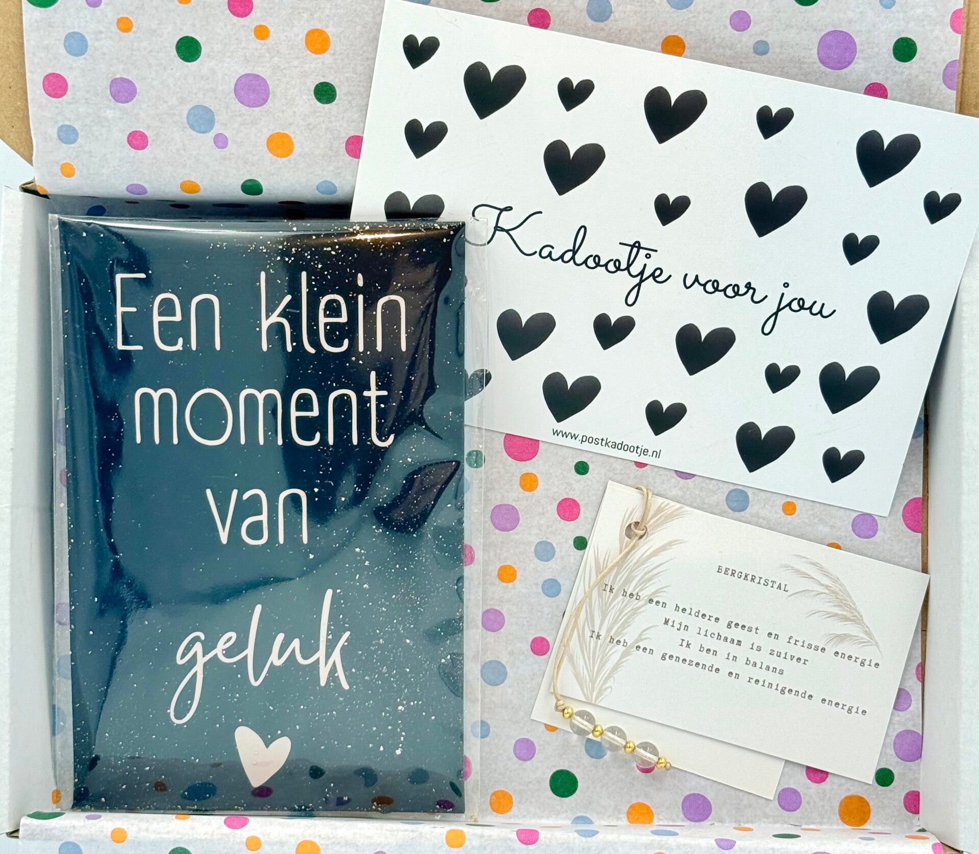 Postkadootje Kristal | BH hangertje bergkristal | Geurzakje een klein moment van geluk | Kaartje naar keuze