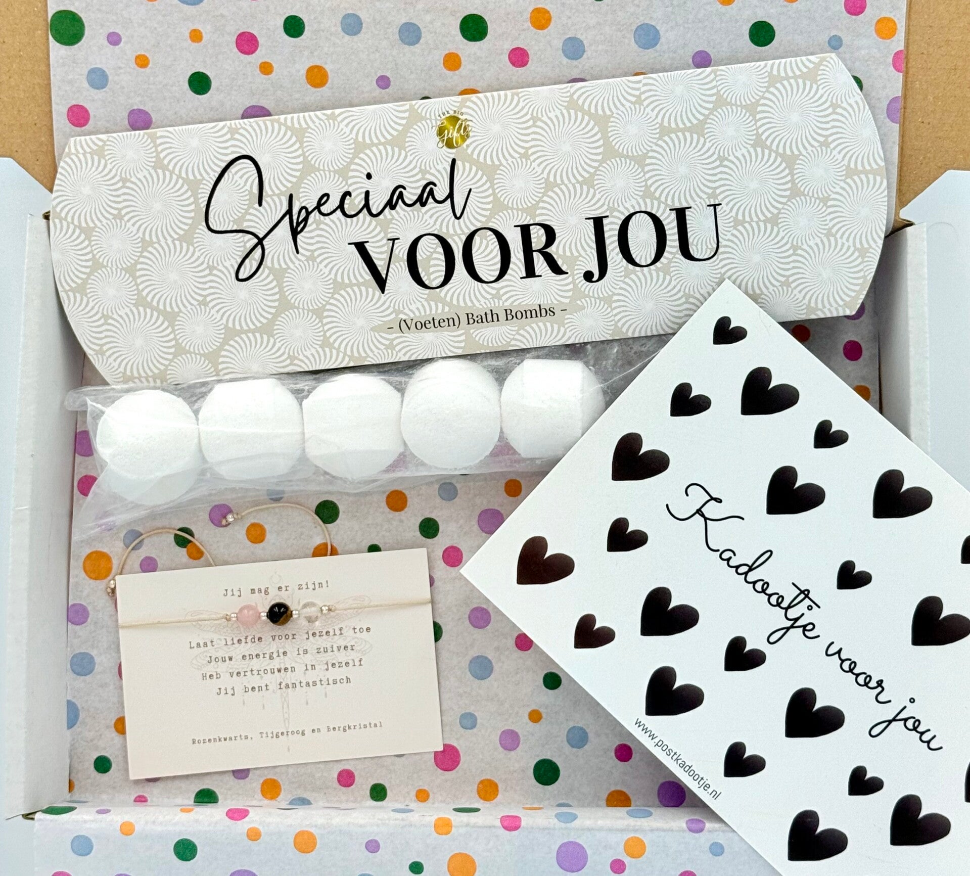 Postkadootje Speciaal voor jou | Bath bombs speciaal voor jou gondeldoosje | Verstelbaar armbandje jij mag er zijn met edelstenen | Kaartje naar keuze