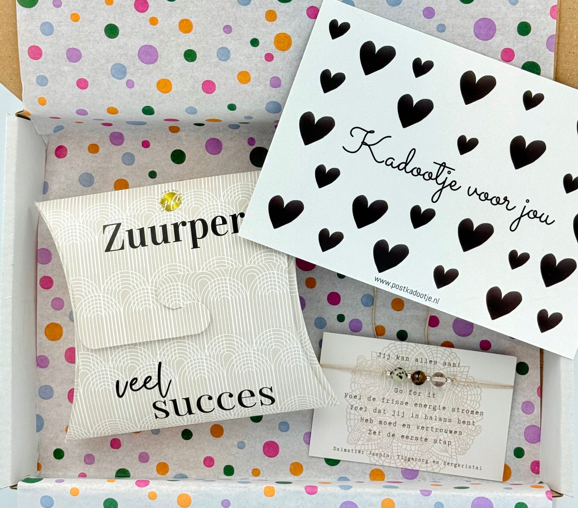 Postkadootje Zuurper | Doosje super veel succes met snoepjes zuurtjes | Verstelbaar armbandje jij kan alles aan! | Kaartje naar keuze