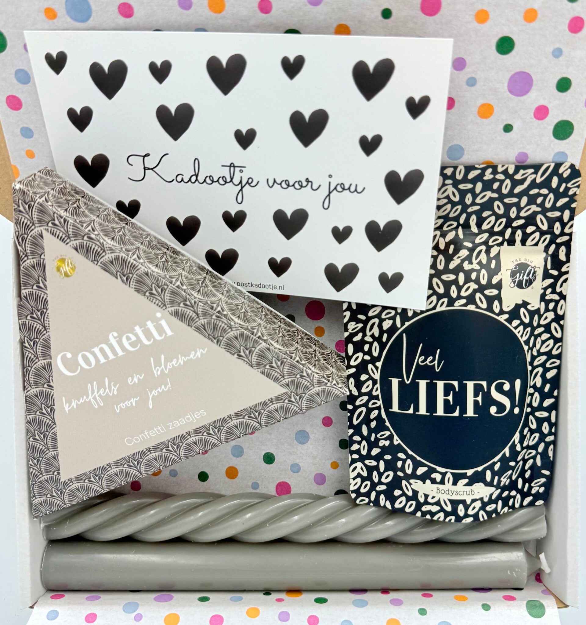 Postkadootje Liefs | Bodyscrub veel liefs | Confetti zaadjes knuffels en bloemen voor jou | Twee kaarsen | Kaartje naar keuze